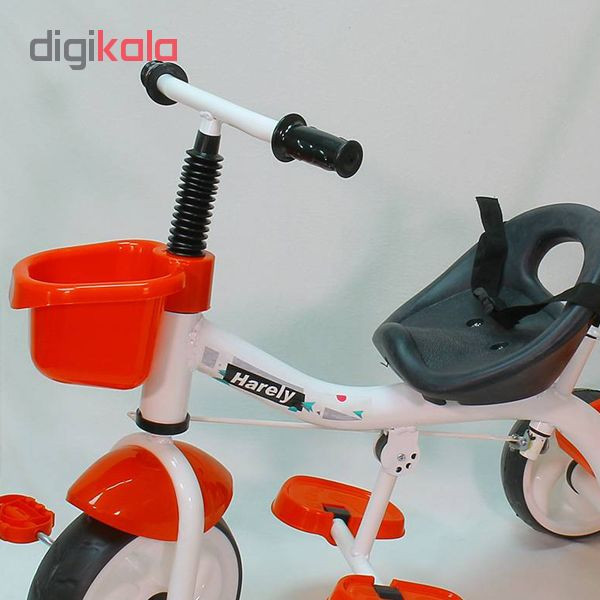 سه چرخه هارلی با دسته هدایت دو سبد یکی در جلو دوچرخ و دیگری در عقب آن دارای جاپایی دارای کمربند ایمنی برای کودکان زیر یک سال مناسب نمی باشد