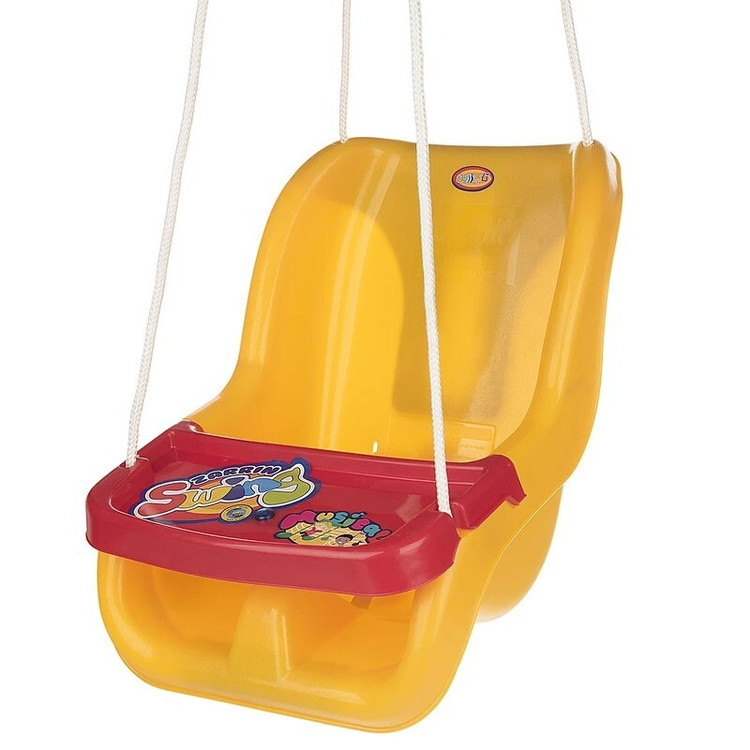 این تاب با قابلیت پخش موزیک و رنگبندی خاصش میتواند جذابیت ویژهای برای کودک داشته باشد. این مدل با توجه به طراحیاش، برای کودکان یک تا سهساله در نظر گرفته شده است. این تاب علاوهبر کمربند دارای محافظ است تا کودک در امنیت کامل به بازی بپردازد. گیرههایی فلزی هم در بستهبندی آن ارائه شده است تا بهراحتی آویزان شود.