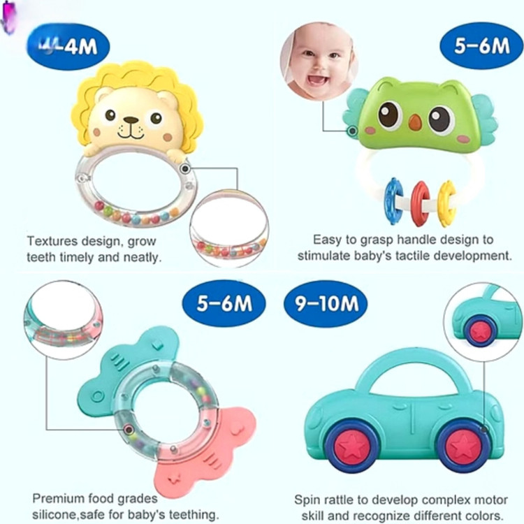 ست جغجغه و دندان گیر کودک مدل حیوانات بسته 7 عددی از مواد ایمن و غیر سمی، سیلیکون مناسب مواد غذایی و بدون نوک تیز ساخته شده و با اطمینان کودکان می توانند جویدن را انجام دهند. اندازه آن برای دست نوزاد راحت است و به دست نوزاد آسیب نمی رساند. دندان گیر راه های زیادی برای بازی دارد از جمله: فشردن، چک کردن، پرتاب کردن مانند توپ. این اسباب بازی کودک برای مدت طولانی از 0 تا حدود 2 سالگی قابل استفاده است.