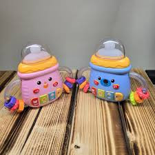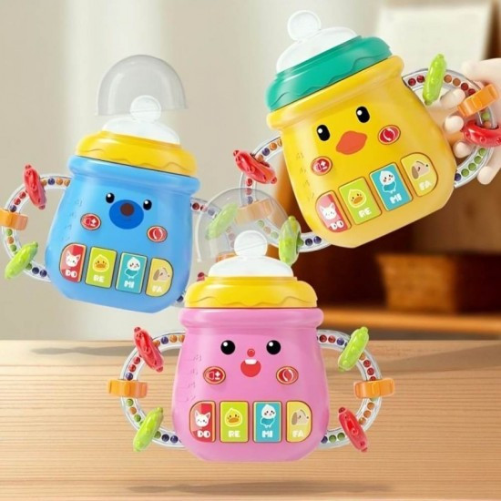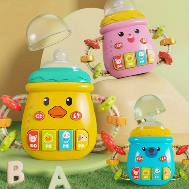 اسباب بازی شیشه شیر جغجغه ای موزیکال چراغدار یک اسباب بازی بسیار سرگرم کننده برای سنین +10 ماهگی است این اسباب بازی موزیکال است و دارای کلید کم زیاد شدن صدا و پخش مجدد که شامل 6 کلید است . دسته اسباب بازی شیشه جغجغه ای است در قسمت سر شیشه این اسباب باری چراغ دار و سر شیشه از جنس سیلیکون میباشد که برای دندانگیر قابل استفاده است . بسیار سرگرم کننده و جذاب برای کودکان است